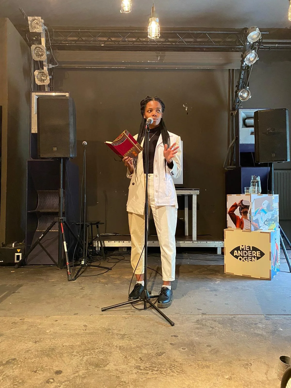 Spoken Word Artist Daniëlle Zawadi betoverde ons allemaal tijdens het eindevent met haar prachtige voordracht ‘Doe je ogen open’ . De woorden deinsden nog lang na en brachten stof tot nadenken. Ze vertaalde de gesprekservaringen van deelnemers naar spoken word.